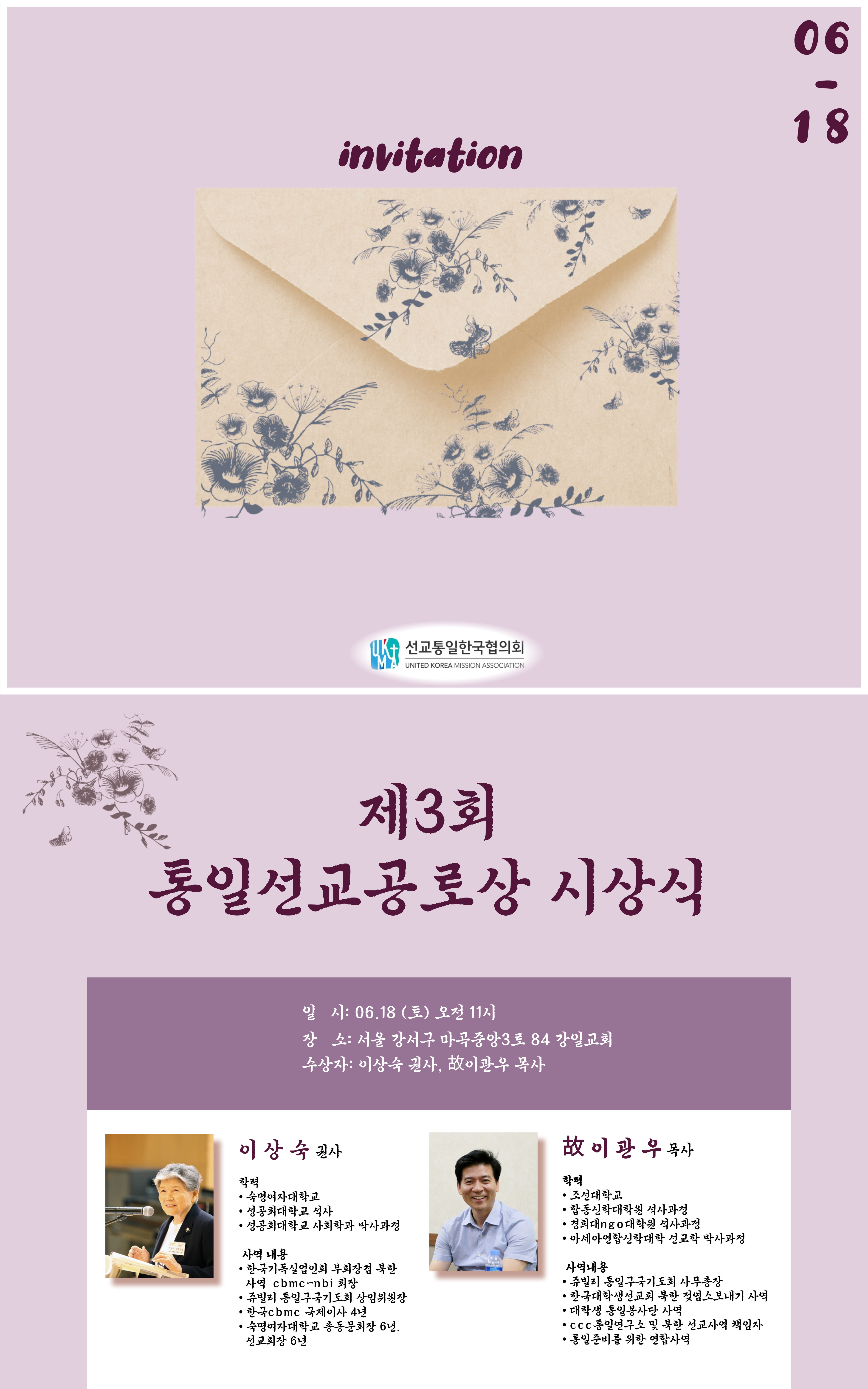 지난 6월 18일(토) 오전 서울 강서 마곡지구 내에 있는 강일교회에서 선교통일한국협의회에서 주관하는 제3회 통일선교공로상 시상식이 있었습니다. 제1회 유관지 목사(북녘교회연구원)과 2회 양영식 장로(전 통일부차관)이 수상한 바 있었는데, 제3회 수상자로 이상숙 권사(전 쥬빌리통일구국기도회 상임위원장)과 고 이관우 목사(CCC)가 선정되었습니다.